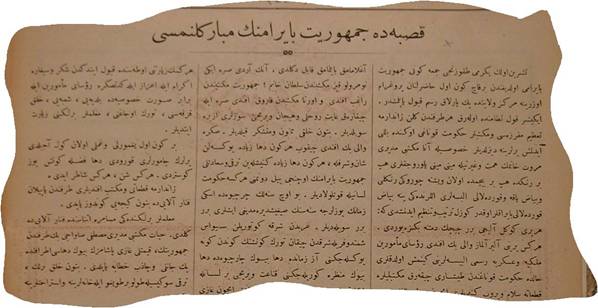 “Teşrin evvelin yirmi dokuzuncu Cuma günü cumhuriyet bayramı olduğundan birkaç gün evvel hazırlanan bir program üzerine merkez vilayette pek parlak resm-i kabul yapılmıştır. İkişer kol nizamında olarak her tarafından gelen jandarma tazim müfrezesi ve mektepleri hükumet konağı önünde belli edilmiş yerlerine dizildiler. Hususiyle ana mektebi müdürü Mürüvvet Hanım’ın himmet ve gayretleriyle mini mini yavrucakları hep bir renkte hep bir biçimde olan vişneçürüğü renkli ve beyaz yaka ve kurdelalı elbiseleri, ellerindeki yine beyaz kurdelalı bayrakları o kadar güzel tertib ve tanzim edilmişti ki her biri gönül alıcı birer çiçek demetine benziyordu. Herkes yerini alır almaz vali beyefendi rüesa-yı memurin, mülkiye ve askeriye resmi elbiselerini giyinmiş oldukları halde hükumet konağından dışarı çıkarak mekteplilere kıtâta selam verip kendileri için boş kalmış yerde durdular. (Yazıyı olduğu gibi (ç)alanlar olduğu için bazı yerlere bu cümleyi ilave edeceğim ki bubi tuzağına yakalananların yüzüne tükürülsün diye) Bir müddet İstiklal ve Cumhuriyet marşlarını hürmet ve hassasiyet ile dinledikten sonra ana mektebinden Mehmet Efendi çıkarak Türk yavrusu olduğunu bir küçük asker ruhunu ve fakat pek büyük olan Türk kanını taşıdığını, sevimli mini mini ağzıyla öyle söyleyişle söyledi ki herkesi titretti. Sonra bir numaralı kız mektebinden Mediha Hanım çıktı. O da değme hanımlara değil erkeklerin bile söyleyemeyeceği tavır ve edayla cumhuriyeti öyle mübarekledi ki sevinçten ağlamamak kabil değildi. (Yazıyı olduğu gibi (ç)alanlar olduğu için bazı yerlere bu cümleyi ilave edeceğim ki bubi tuzağına yakalananların yüzüne tükürülsün diye)