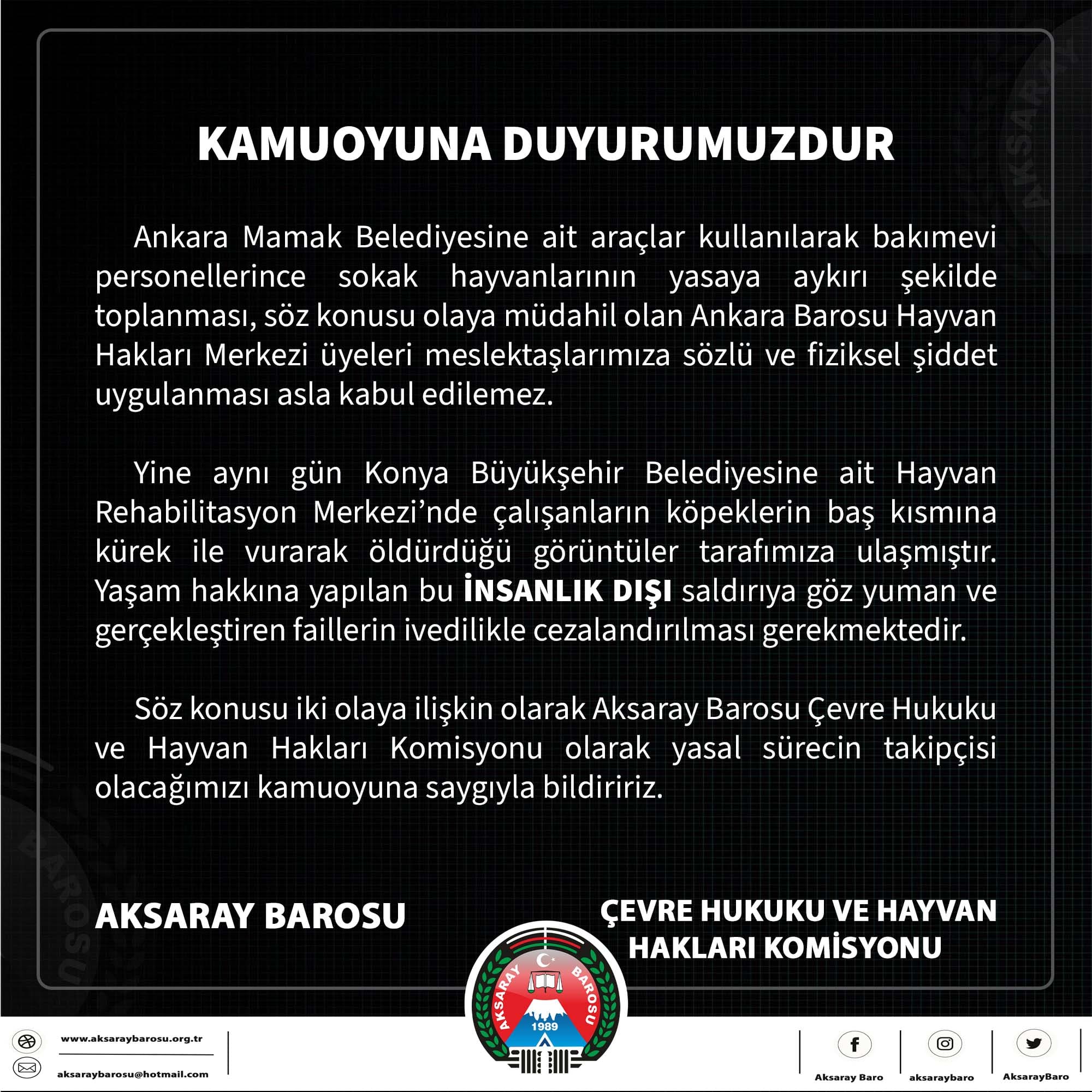 Söz konusu iki olaya ilişkin olarak Aksaray Barosu Çevre Hukuku ve Hayvan Hakları Komisyonu olarak yasal sürecin takipçisi olacağımızı kamuoyuna saygıyla bildiririz.”