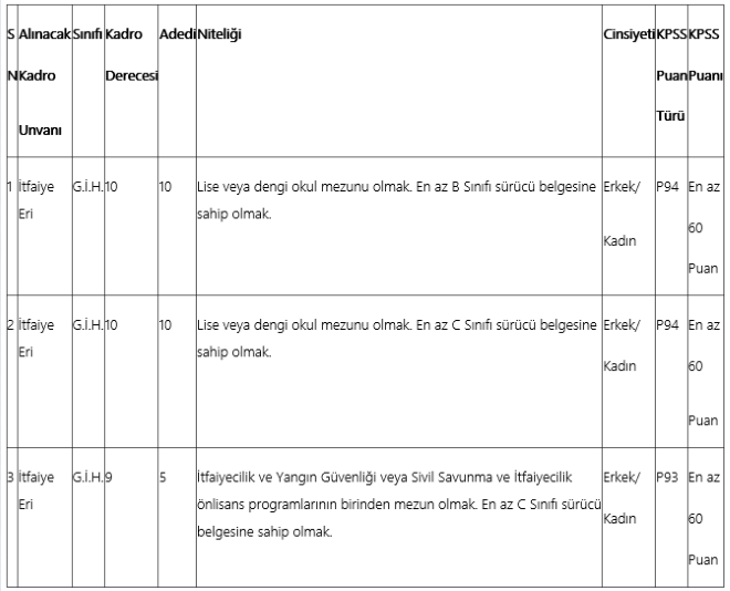 Aksaray Belediye Başkanlığı bünyesinde 657 sayılı Devlet Memurları Kanununa tabi olarak istihdam edilmek üzere; Belediye İtfaiye Yönetmeliği hükümlerine göre aşağıda unvanı, sınıfı, derecesi, adedi, nitelikleri, KPSS türü, KPSS taban puanı ve diğer şartları taşımak kaydıyla, belirtilen boş kadrolara açıktan atama yoluyla memur alınacaktır.