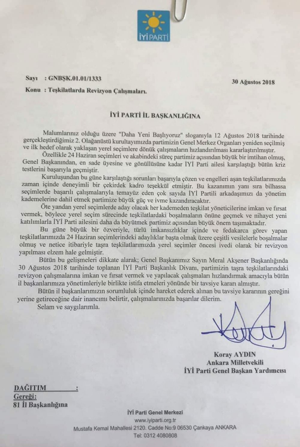 İYİ Parti’de Teşkilatlardan Sorumlu Genel Başkan Yardımcısı Koray Aydın imzalı genelgede istifa çağrısında şu ifadelere yer verildi: