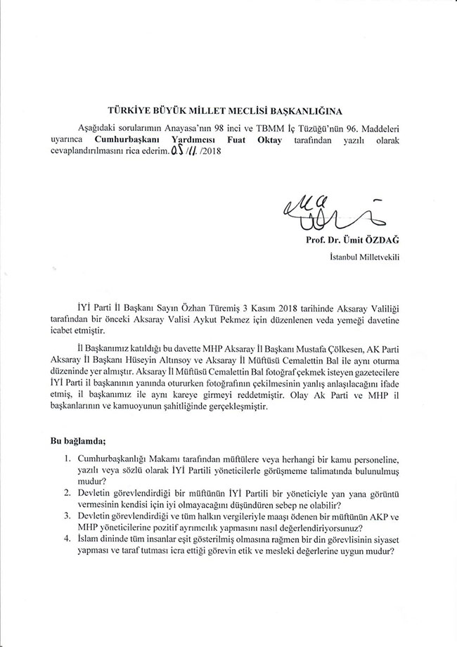 Cumhurbaşkanlığı Makamı tarafından müftülere veya herhangi bir kamu personeline, yazılı veya sözlü olarak İYİ Partili yöneticilerle görüşmeme talimatında bulunulmuş mudur?Devletin görevlendirdiği bir müftünün İYİ Partili bir yöneticiyle yan yana görüntü vermesinin kendisi için iyi olmayacağını düşündüren sebep ne olabilir?Devletin görevlendirdiği ve tüm halkın vergileriyle maaşı ödenen bir müftünün AKP ve MHP yöneticilerine pozitif ayrımcılık yapmasını nasıl değerlendiriyorsunuz?İslam dininde tüm insanlar eşit gösterilmiş olmasına rağmen bir din görevlisinin siyaset yapması ve taraf tutması icra ettiği görevin etik ve mesleki değerlerine uygun mudur? (Yeniçağ)