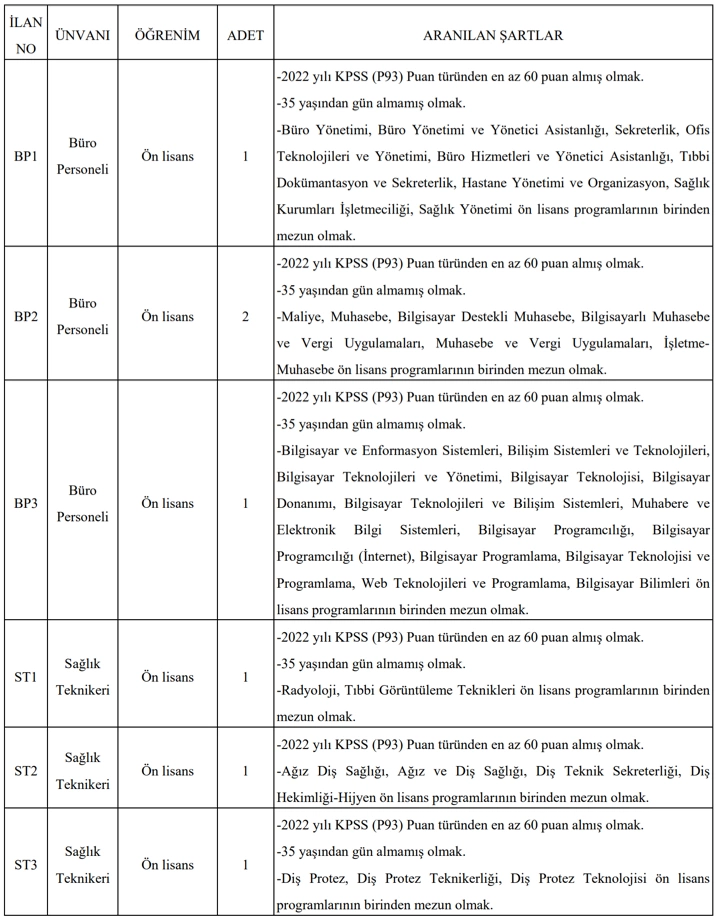 Adaylardan KPSS Şartı aranacak. 2022 yılında yapılan KPSS’den Lise için P94 ve Ön Lisans için P93 puan türünden en az 60 puan almış olmak şartı aranacak.