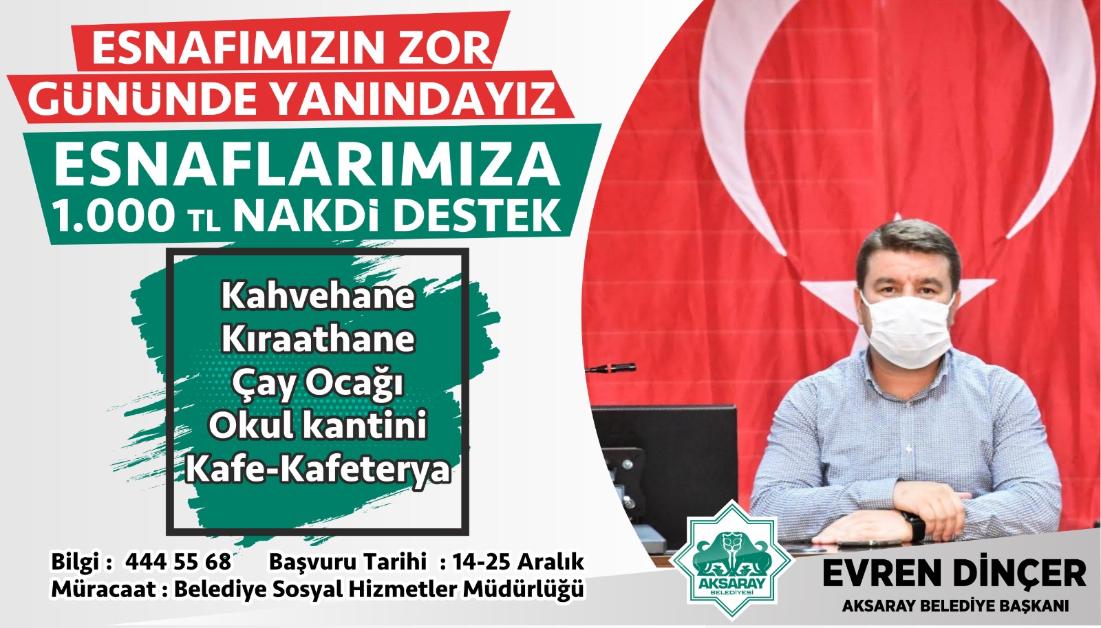 Destek paketinden yararlanmak isteyen esnaflara Aksaray Belediyesi’ne ait 444 55 68 numaralı telefondan bilgi verilecek. Başvurular 14 Aralık ve 25 Aralık tarihleri arasında Aksaray Belediyesine bağlı Sosyal Hizmetler Müdürlüğüne bizzat yapılacak.