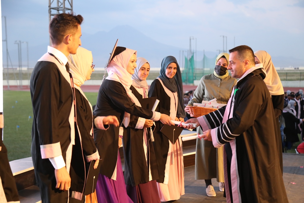 Mezuniyetlerin birkaç açıdan insan hayatının dönüm noktası olduğuna dikkat çeken Şahin, “Yıllar süren arkadaşlıklara, güzel hatıralara vedayı içerdiği için hüzün, okulu bitirmeyi ve başarmayı içerdiği için sevinç, yeni bir hayata başlamayı ve ayakları üzerinde durma sürecini içerdiği için de heyecandır. Mezun öğrencilerimizi kutluyoruz. Onların eğitim-öğretim süreçlerine katkı sunan tüm akademisyenlerimizi tebrik ediyoruz. En büyük teşekkür ise öğrencilerimizin ailelerinedir. Onların destekleri, emekleri ve duaları ile öğrencilerimiz, ülkemize ve milletimize hizmet etme yolunda ilerliyor” dedi.