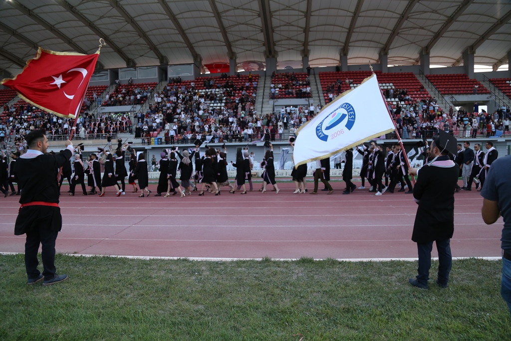 ASÜ Stadyumundaki törenlere il protokolü, Üniversite yönetimi, akademisyenler, öğrenciler ve öğrenci yakınları katıldı. Protokol konuşmaları ile başlayan törenlerde dereceyle mezun olan öğrencilere plaket ve belgeleri takdim edildi, mezuniyet yürüyüşleri yapıldı ve sembolik diplomaların teslim edilmesinin ardından havai fişek gösterisi eşliğinde öğrenciler keplerini fırlattı.