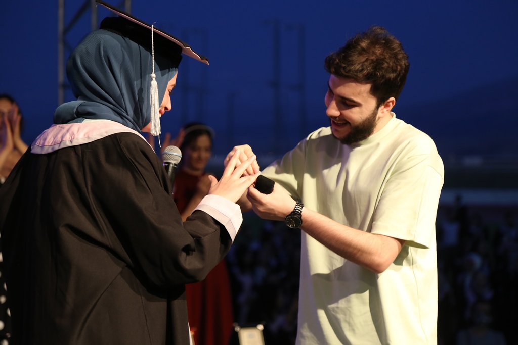 * 24 yaşındaki Muhammet Yeşiltaş, İktisadi ve İdari Bilimler Fakültesi’nden mezun olan kız arkadaşı Merve Yozgat’a yüzlerce kişinin önünde evlilik teklif etti. Gelen “Evet” cevabının ardından töreni izleyenler genç çifte alkışlarla destek verdi.