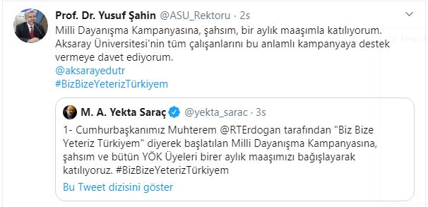 Erdoğan’ın bu açıklamasının ardından Aksaray Üniversitesi Rektörü Prof. Dr. Yusuf Şahin de maaşını bağışlayarak kampanyaya destek verdi. Rektör Şahin kampanyaya 1 aylık maaşını bağışladığını belirtti..