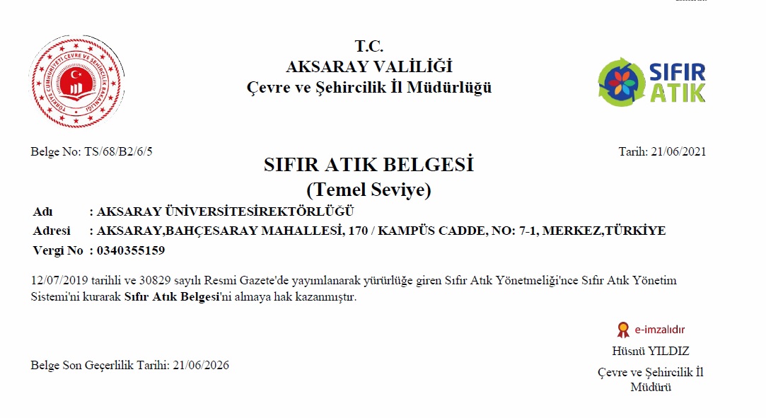 ASÜ, Sıfır Atık Yönetmeliğinde belirtilen kriterler hususunda yaptığı başarılı çalışmaların ardından Sıfır Atık Yönetim Sistemi’ni kurdu ve yapılan incelemelerin ardından “Temel Seviye Sıfır Atık Belgesi” almaya hak kazandı.