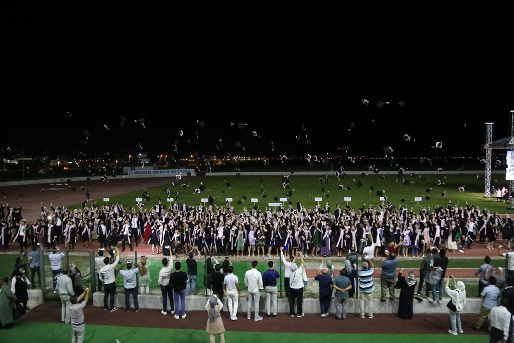 Yemin törenlerinin de tamamlanmasıyla öğrenciler, havai fişek gösterisi eşliğinde keplerini havaya atarak mezuniyetlerini kutladı.