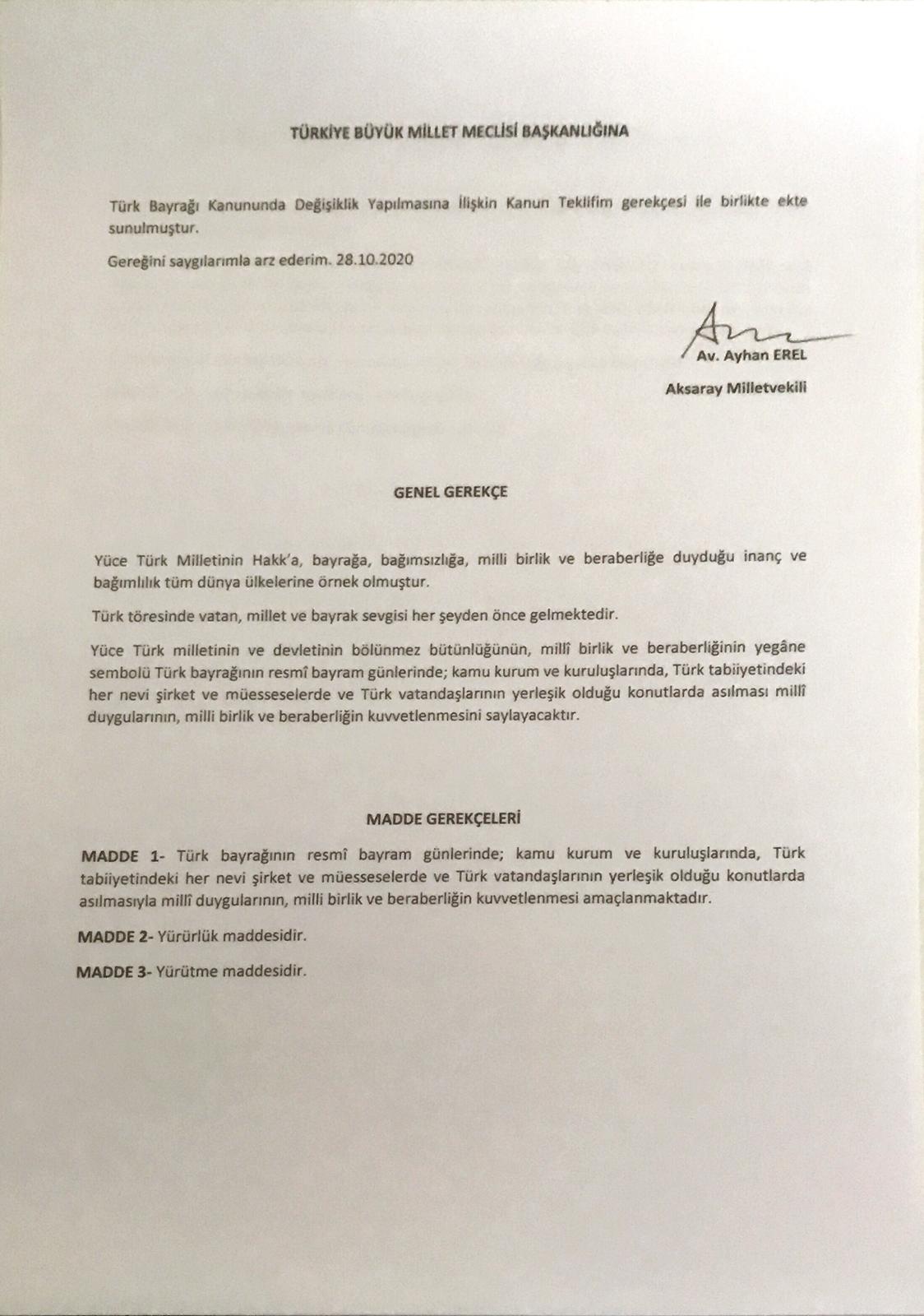 İYİ Parti Aksaray Milletvekili Ayhan Erel, Türk bayrağının milli bayramlarda kamu kurum ve kuruluşları yanı sıra her nevi şirket ve müessesede ve vatandaşların kendi konutlarına asmasına ilişkin kanun teklifi verdi.