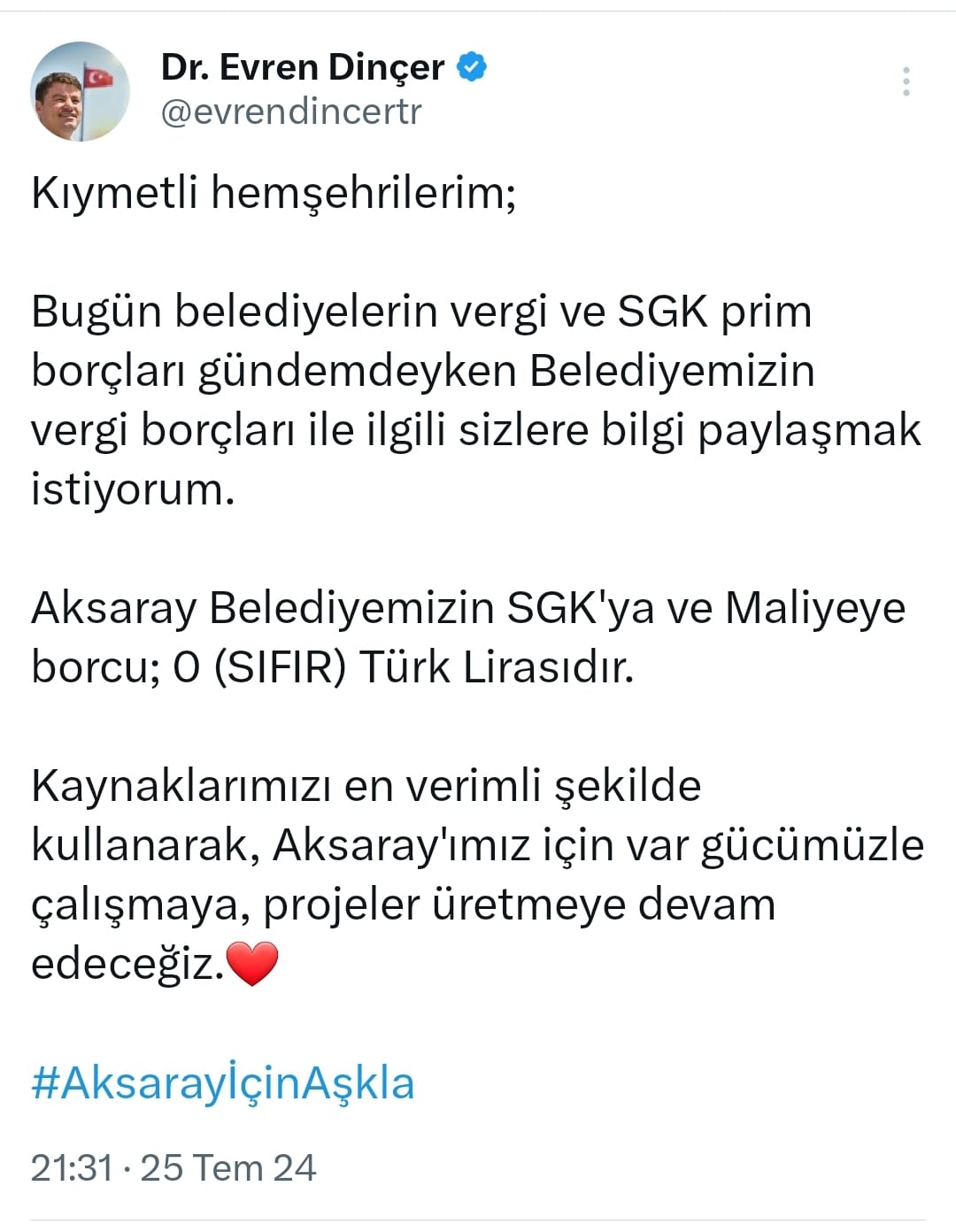 Belediye Başkanı Dr. Evren Dinçer Aksaray Belediyesi’nin SGK ve maliyeye borcunun olmadığını sosyal medya hesabından açıkladı.