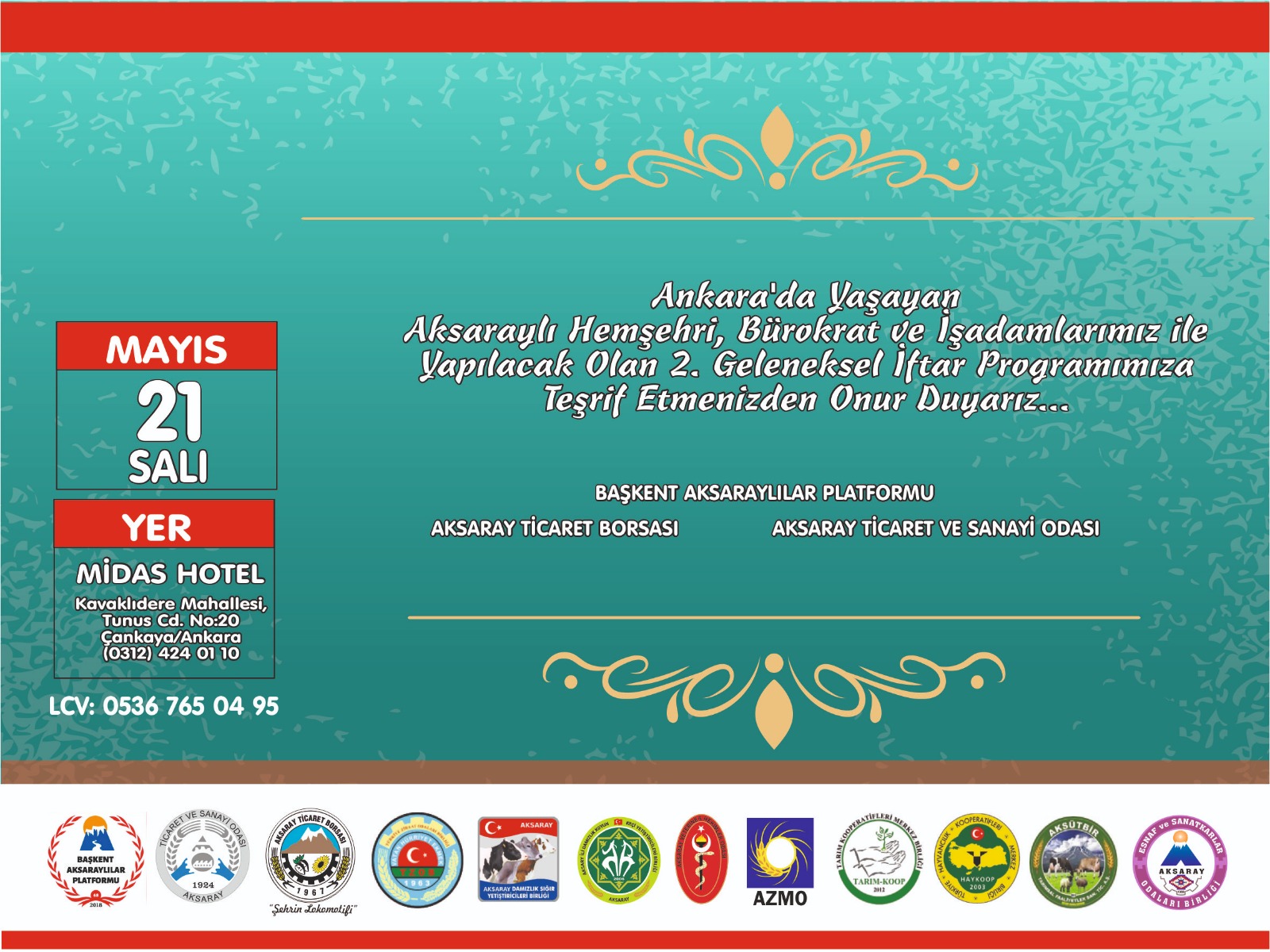 Başkent Aksaraylılar Platformu tarafından yapılan açıklamaya göre, Aksaray Ticaret Borsası ve Aksaray Ticaret ve Sanayi Odası başkan ve yöneticilerinin de katılacağı iftar programı 21 Mayıs Salı günü Midas Hotel’de gerçekleştirilecek.
