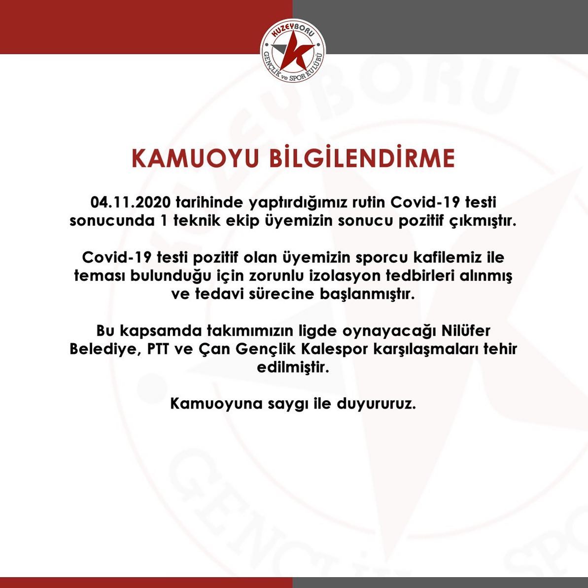 Yapılan açıklamada, “04.11.2020 tarihinde yaptırdığımız rutin Covid-19 testi sonucundan 1 teknik ekip üyemizin sonucu pozitif çıkmıştır. Covid-19 testi pozitif olan üyemizin sporcu kafilemiz ile teması bulunduğu için zorunlu izolasyon tedbirleri alınmış ve tedavi sürecin başlanmıştır.