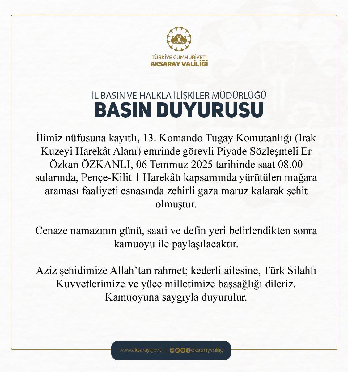 Aksaray Valiliği tarafından yapılan resmi açıklamada, şehidin 6 Temmuz 2025 tarihinde sabah saat 08.00 sularında Pençe-Kilit 1 Harekâtı kapsamında yürütülen mağara tarama faaliyetinde gazdan etkilendiği belirtildi.