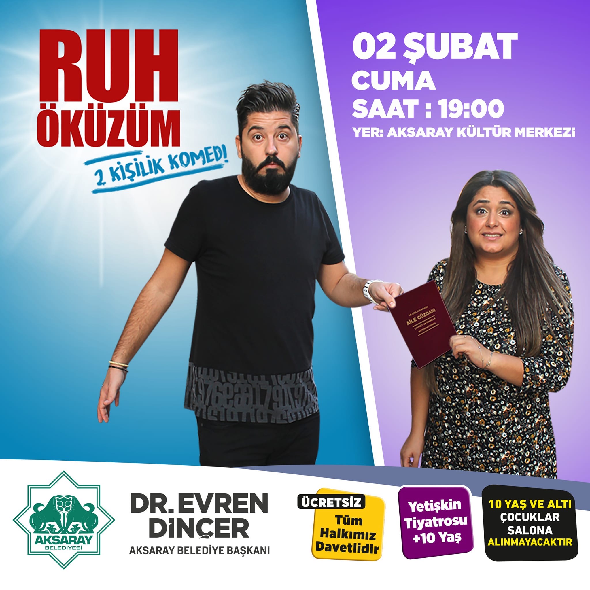 Güldür Güldür kadrosundan tanınan Tuğçe Karabayır ile Yetenek Sizsiniz finalisti Erkan Karadeniz’in oynadığı “Ruh Öküzüm” isimli tiyatro oyunu Aksaray Belediyesi’nin kültür ve sanat etkinliği kapsamında tiyatro severlerle buluşmaya hazırlanıyor.