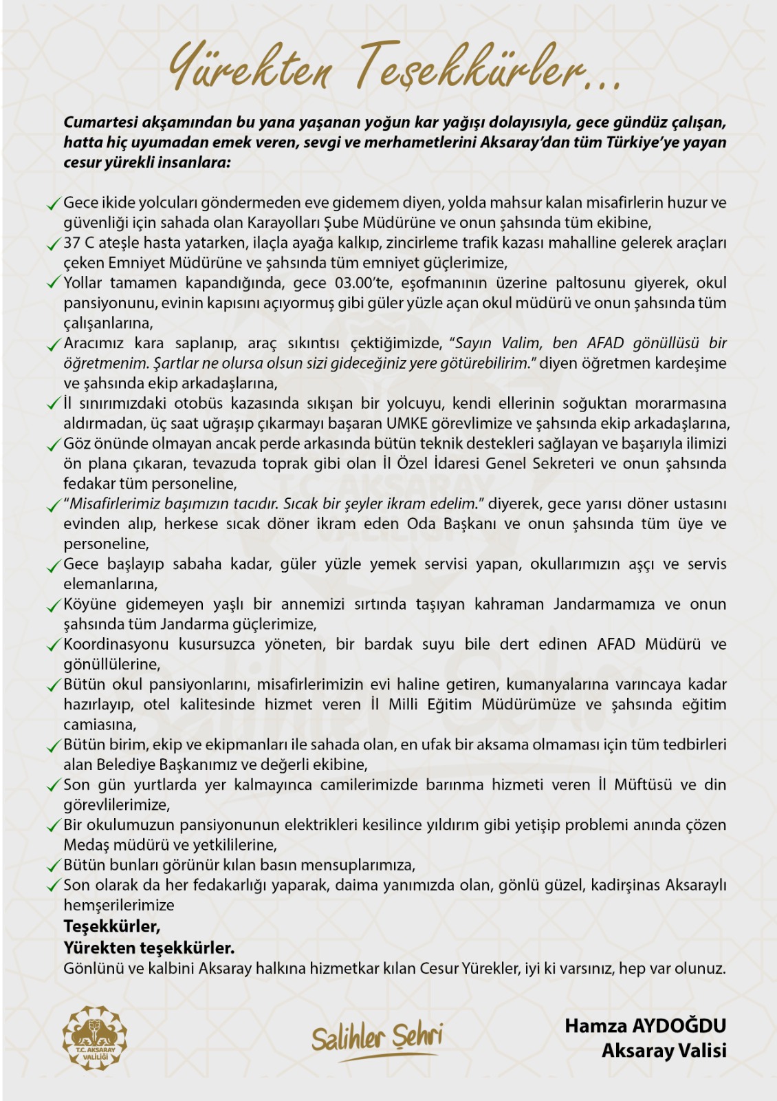 “Cumartesi akşamından bu yana yaşanan yoğun kar yağışı dolayısıyla, gece gündüz çalışan, hatta hiç uyumadan emek veren, sevgi ve merhametlerini Aksaray’dan tüm Türkiye’ye yayan cesur yürekli insanlara: